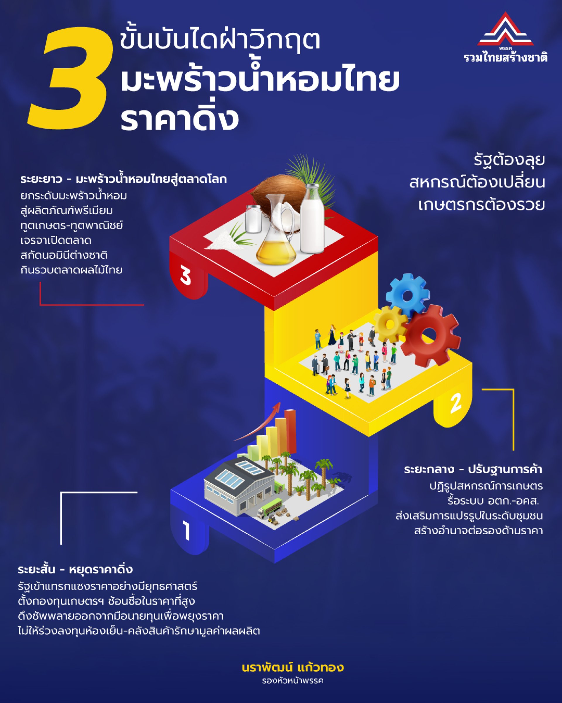 นายนราพัฒน์ แก้วทอง รองหัวหน้าพรรครวมไทยสร้างชาติ แสดงความเห็นถึงสถานการณ์ราคามะพร้าวน้ำหอมเผชิญวิกฤตหนัก หลังราคาผลผลิตเหลือเพียงลูกละ 2-3 บาท ตกต่ำในรอบหลายปี จากเดิมที่เคยมีราคาลูกละ 30 บาท โดยระบุว่า ต้นตอสำคัญมาจากปัญหาสินค้าล้นตลาดที่ประจวบเหมาะกับการที่ผู้ประกอบการไม่สามารถขยายตลาดได้ทันท่วงที อย่างไรก็ตามประเด็นที่น่ากังวลยิ่งกว่าคืออาจมีกระบวนการ ‘รวมหัวกดราคา’ เนื่องจากผู้ประกอบการรายใหญ่เป็นผู้ถือครองช่องทางจำหน่ายและตลาดปลายทาง จึงอาจมีการตกลงกดราคารับซื้อ เกษตรกรผู้ปลูกมะพร้าวไม่สามารถเข้าไปมีส่วนร่วมในซัพพลายเชนส่วนนี้ ทำให้เป็นฝ่ายเสียเปรียบและต้องยอมรับราคาที่ไม่เป็นธรรมมาโดยตลอด